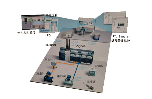 RTU-3600在抽油机物联网应用中扮演了关键的角色,可灵活搭配Wifi/3G/GPRS模块以满足广域远程的数据传输需求,并支持Zigbee协议无线连接现场温度仪表、示功仪等装置。现场发生的事件皆会被打上时标(SOE),在远程WebAccess画面上进行呈现和工况诊断。