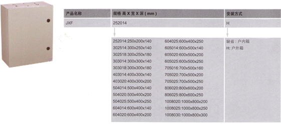 JXF配电箱使用示例 JXF配电箱以其极强的扩展性及自有暗装元器件的特有属性,除用于户内配电使用外,亦广泛用于楼宇的楼层配电,内部安装塑壳式断路器及断路器元器件,实现简单动力箱功能。 户外防雨型JXF配电箱,为内部控制回路及元器件提供更好保护,广泛用于露天环境,实现配电控制功能。 不锈钢型JXF配电箱,选用耐腐蚀性能更好的不锈钢材质,为特殊环境中的配电系统提供安全保障,广泛用于公共事业、油田、化工、港口、码头等环境。
