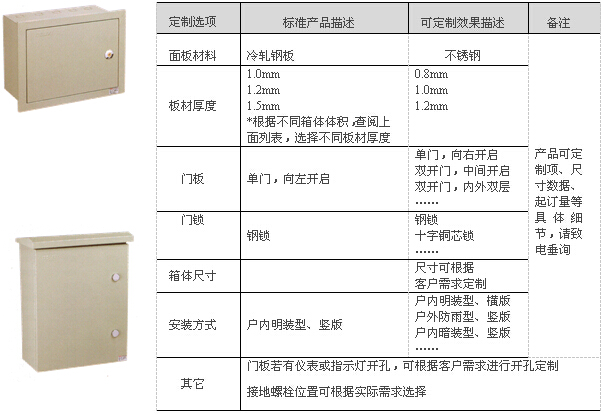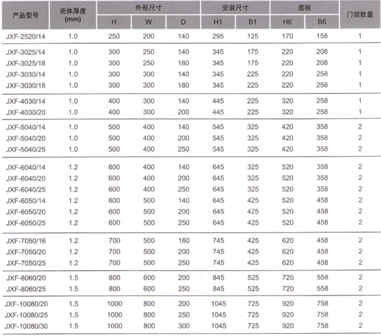注:另有户内暗装箱接受定制,订货在户内箱后加“R”; 如箱体尺寸为250×200×150,暗装箱,订货号为JXF252015R 技术参数 ■ 额定工作电压:230/380V AC ■ 短时耐受电流:6/15kA ■ 最大额定工作电流:125A ■ 箱体材料: □ 整箱采用冷轧钢板制造,表面采用静电喷涂处理,坚固耐用,具有极好耐腐蚀性 □ 颜色为卵石灰(RAL7032) ■ 符合标准:GB17466-2008 ■ 防护等级:IP30