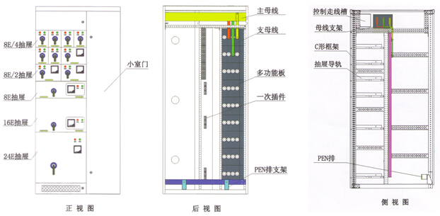 3、结构设计紧凑:单柜抽屉式基本模数为九个馈出单元,每个基本模数单元又可再分成二个或四个馈出回路(单柜最多可达36个抽屉回路),并可任意组合配置;抽屉单元的机械联锁机构均符合标准,具有连接、试验、分离三个明显状态指示位,操作安全可靠;采用标准模块设计:可组成保护、控制、转换、测量、指示等标准单元,根据要求任意组装;垂直母线用高绝缘强度阻燃型塑料功能板保护,具有抗故障电弧性能;
